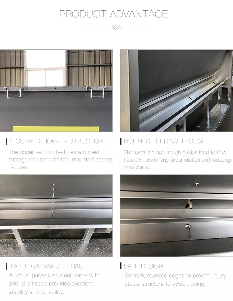 1. Estructura de tolva curva: La sección superior cuenta con una tolva de almacenamiento curva con manijas de acceso montadas en la parte superior, lo que permite un fácil llenado y mantenimiento.